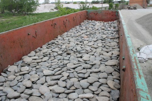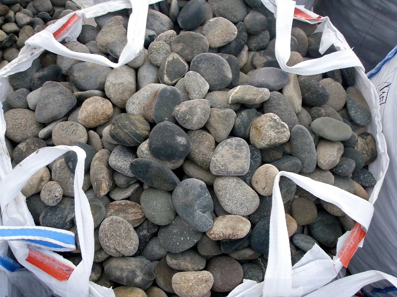 Крупная галька этого типоразмера (от 100 до 300 мм) уже напоминает небольшие валунчики: это красивый и гладкий речной камень, получивший свою округлую форму от сил природы – волн и течений. Благодаря удобной уплощенности отделка этим натуральным камнем становится очень простой: по сути, это готовая естественная облицовочная плитка или брусчатка для мощения. Такая галька, цена которой у нас низка благодаря собственной добыче, отпускается в мягких контейнерах или насыпом в кузов машины, тоннами. Эти симпатичные плоские натуральные камни у нас можно поистине удачно купить оптом!